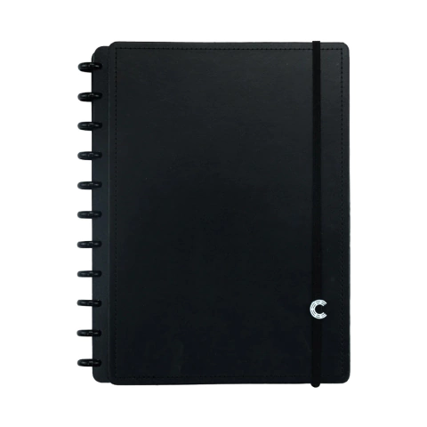 Capa e contracapa rígidas, 01 folha de adesivos, 01 bolsa plástica, 01 folha de instrução de uso e manuseio, com refis e acessórios da marca disponíveis no verso, 01 folha de identificação com calendário no verso, 04 divisórias com abas para identificação, 80 folhas offset 90g (60 folhas pautadas e 20 folhas lisas brancas para impressão), 01 suporte com elástico para 01 caneta ou 01 lápis e discos M + elástico.